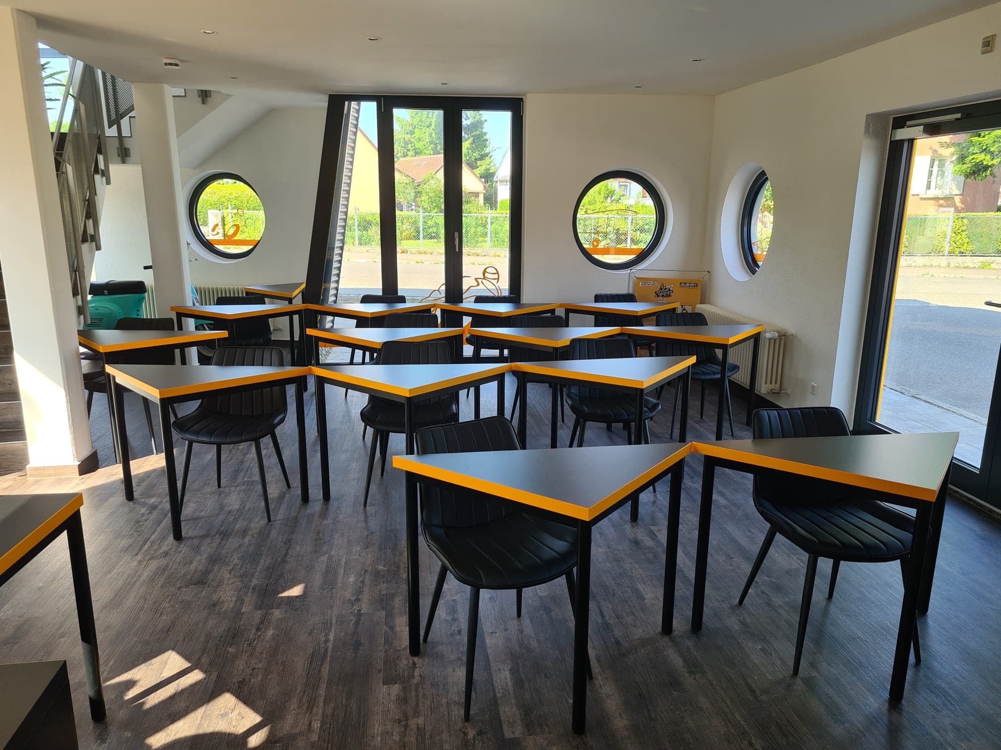 Es gibt einen großen und hellen Schulungsraum im Erdgeschoss und im oberen Stock einen kleinen Raum für kleinere Gruppen.